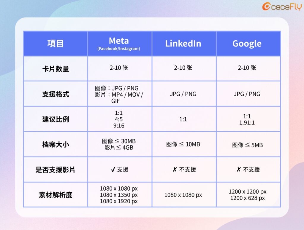 魔鬼藏在细节里,面对各平台不同的介面特性,品牌不仅要懂创意,更要确保能精准执行。cacaFly 梳理了 Meta、LinkedIn、Google 三大平台的轮播广告应用规格与操作重点,助品牌了解平台差异,让每一份创意都能在正确的舞台上完整呈现。