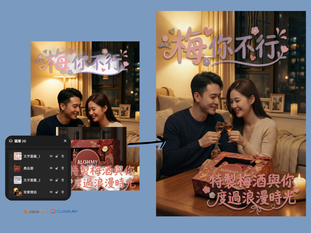 用户可以先导入产品图层,将其锁定并摆放在画面的黄金位置,确保产品细节 100% 真实不变形。接着针对背景图层与文字图层下指令,生成想要的画面与标题,不必担心会影响到产品本身。最后让 AI 担任「光影魔术师」,将原本独立的各个图层自然地融入画面中。