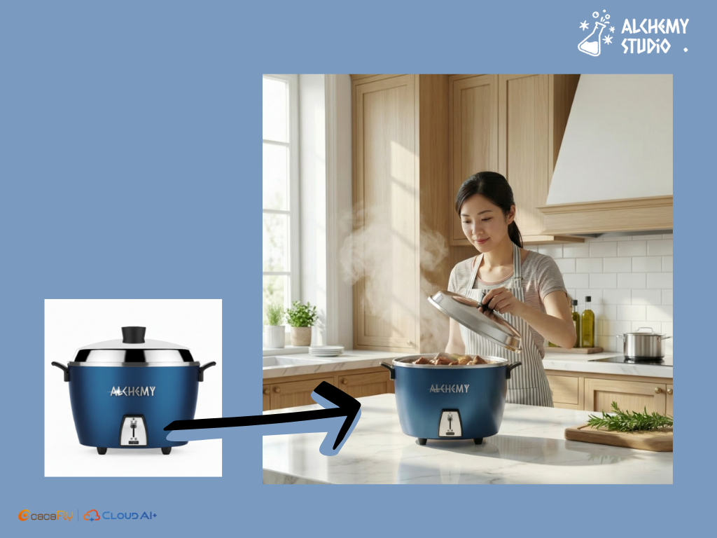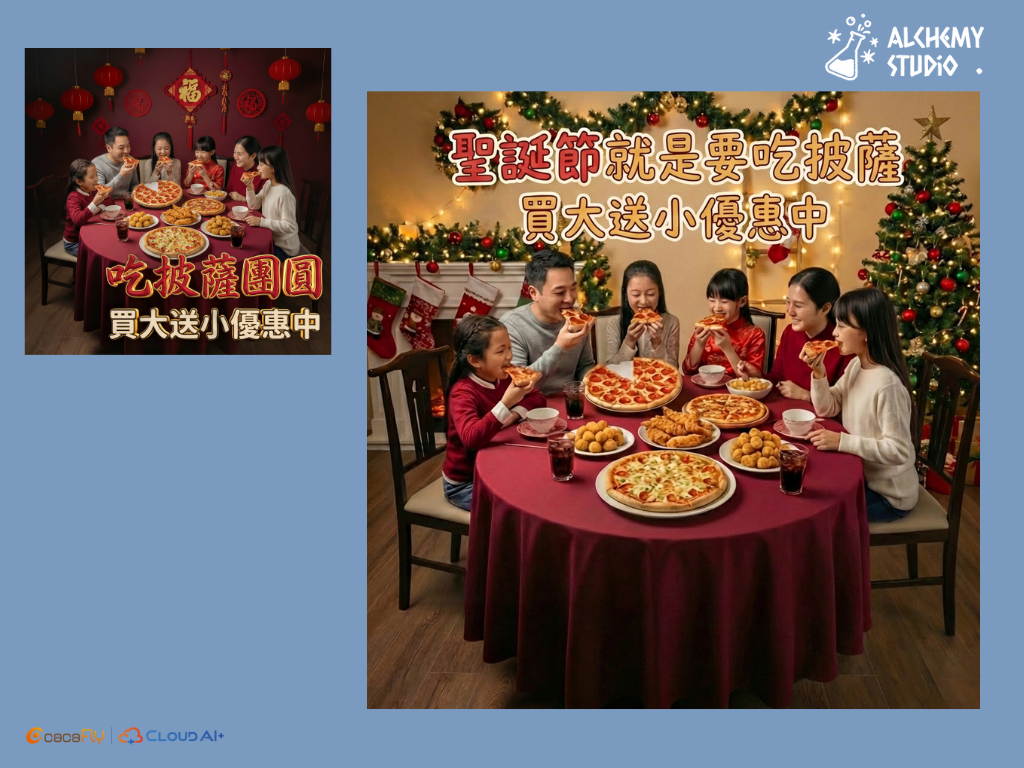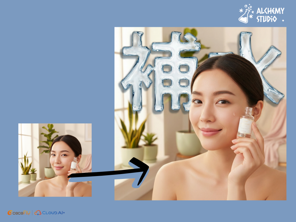 为了将素材应用最大化,品牌常需要修改既有素材,将其运用在不同的促销期中。这时候品牌需要透过复杂指令来进行精细修改,面对这类指令,传统 AI 往往只能择一执行,导致营销人最终还是得进修图软件进行二次加工。cacaFly Alchemy Studio 导入具备「推理能力」的专业模型,它能像资深设计师一样,一次听懂并执行多层次的需求,系统能理解复合任务。让品牌可以运算出符合不同光影的背景,并运用专业的文字渲染技术,写上新文案,实现了营销素材的敏捷迭代。