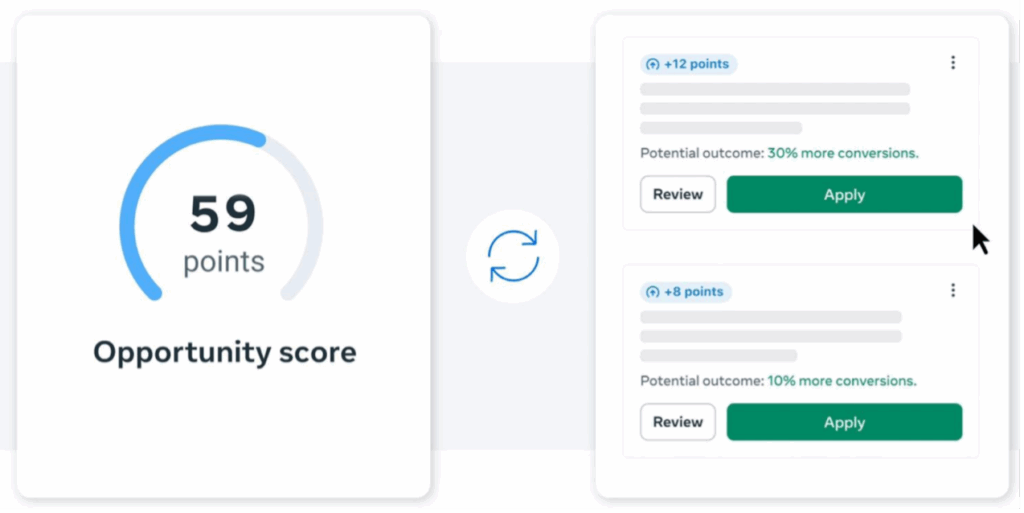 1. Score: Meta uses an Opportunity Score ranging from 0 to 100 to indicate how optimized your campaigns, ad sets, and ads are.