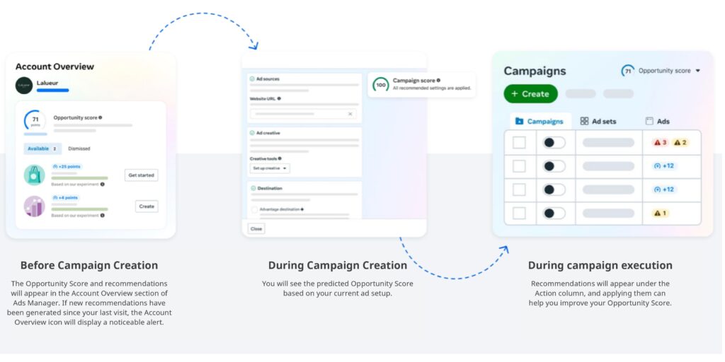 1. Before Campaign Creation: The Opportunity Score and recommendations appear in the “Account Overview” section of Ads Manager.