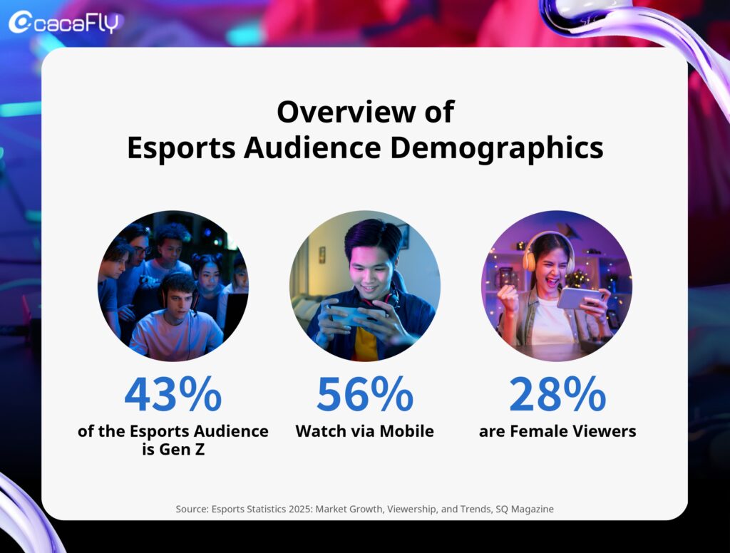 Looking further at the audience profile, the 18 to 34 age group remains the main force in global esports. Among them, Gen Z has the highest proportion and is expected to account for 43% of global esports viewers in 2025, highlighting the influence and participation intensity of esports among young groups. At the same time, the proportion of female viewers continues to climb, showing that esports is gradually stepping out of a single-demographic framework to become a mainstream entertainment option across different groups.