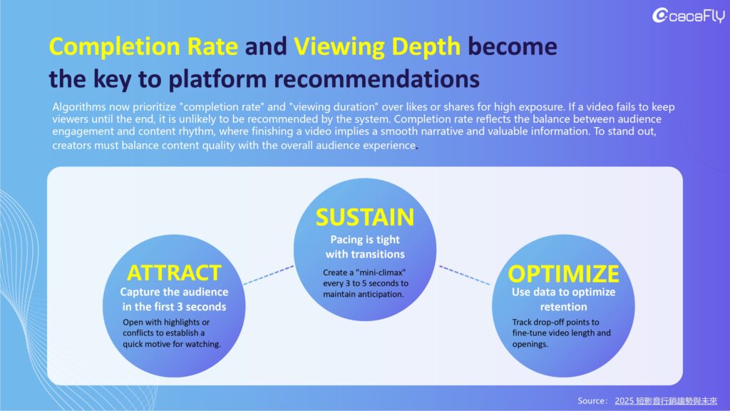 Current platform algorithms for TikTok, Reels, and Shorts place a high priority on viewing depth. If a video fails to keep viewers until the end, the system will reduce its recommendation traffic.