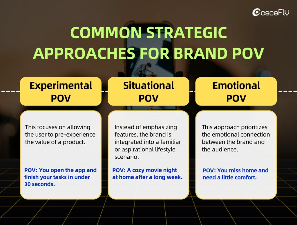 3. Emotional POV: This approach prioritizes the emotional connection between the brand and the audience. When content touches a viewer’s emotions, the brand becomes part of a long-term memory.
